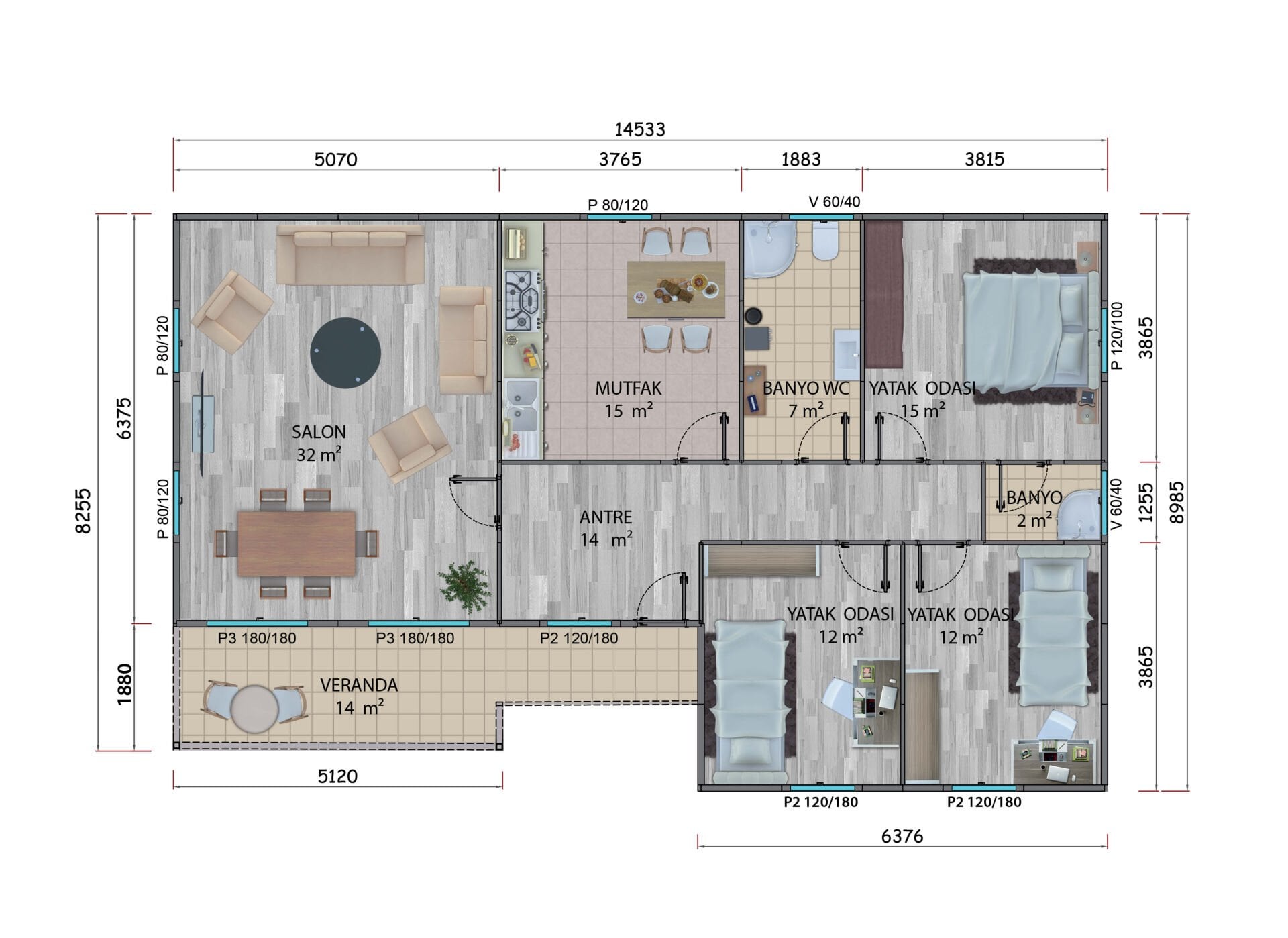 - Pencereler : Beyaz Renk PVC Pencere Çift Cam,