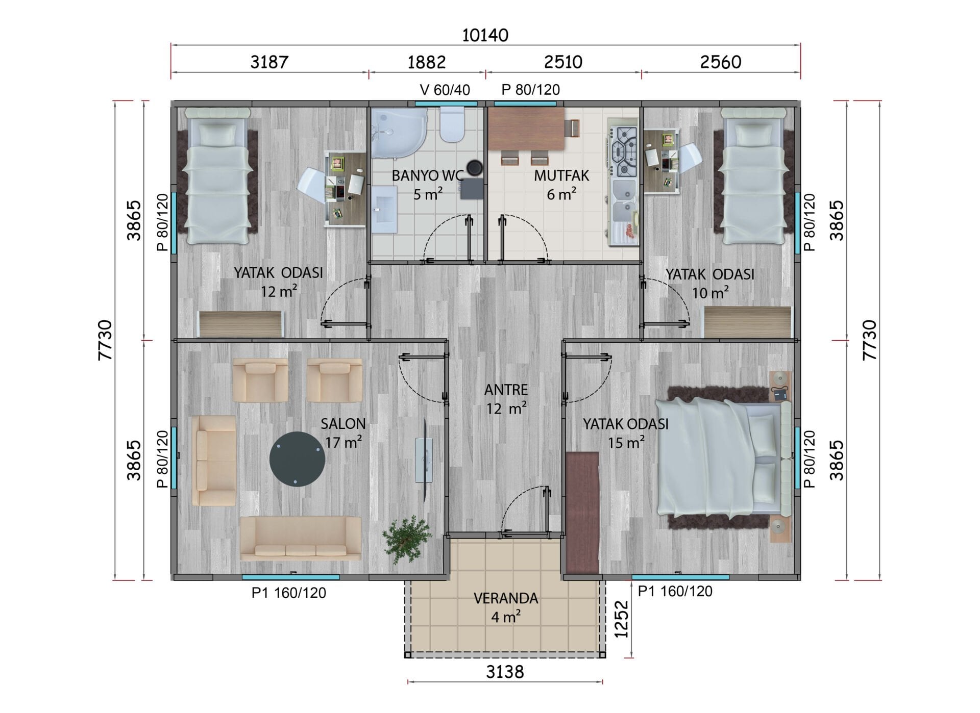 - Pencereler : Beyaz Renk PVC Pencere Çift Cam,