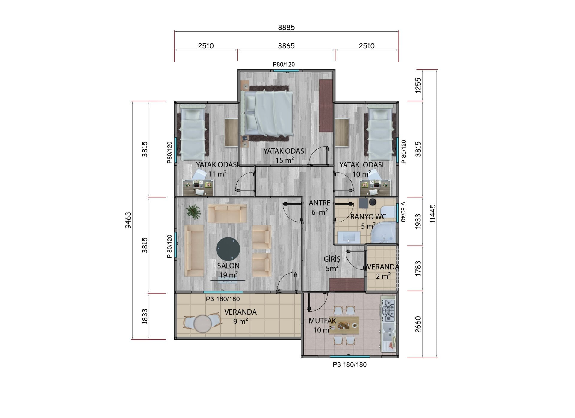 - Dış Duvar : 10 cm (Betopan + Sıkıştırılmış Köpük + Betopan),