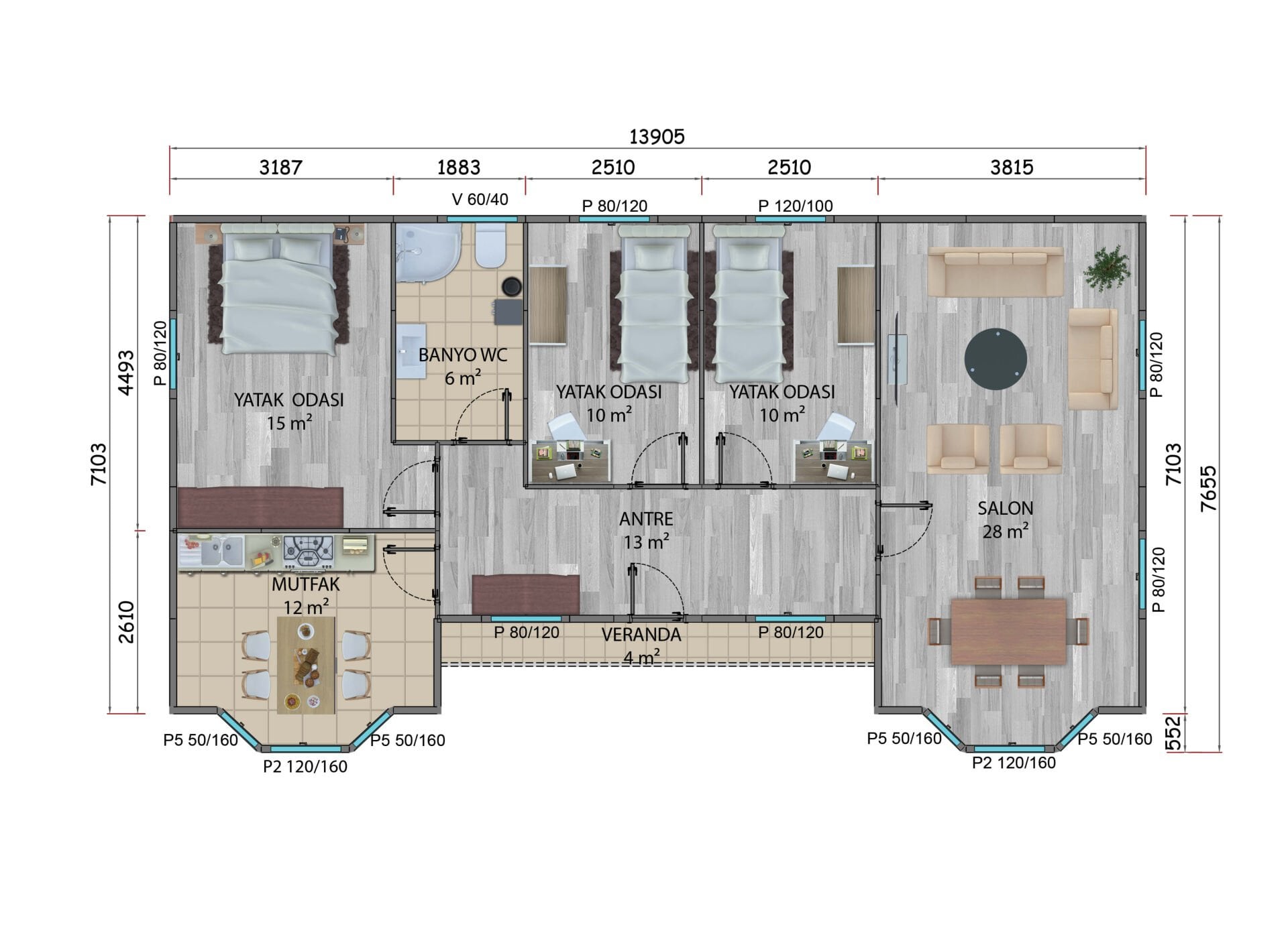 - Dış Duvar : 10 cm (Betopan + Sıkıştırılmış Köpük + Betopan),